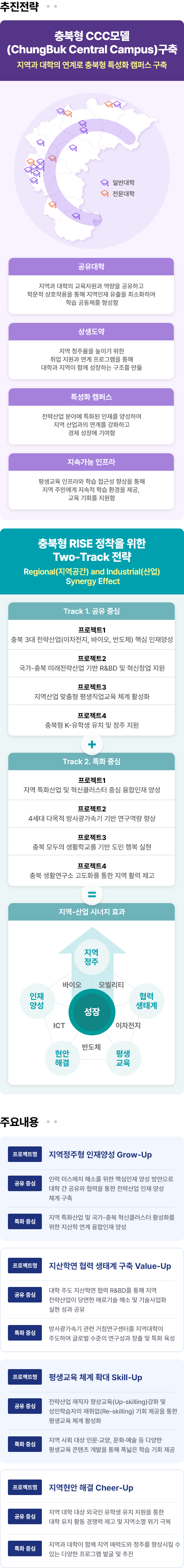 충북지역대학혁신지원센터는 교육부의 지역혁신중심 대학지원체계(RISE) 추진을 위한 전담 기관으로 지자체 주도의 지역별 맞춤형 대학지원을 위해 설립되었습니다.