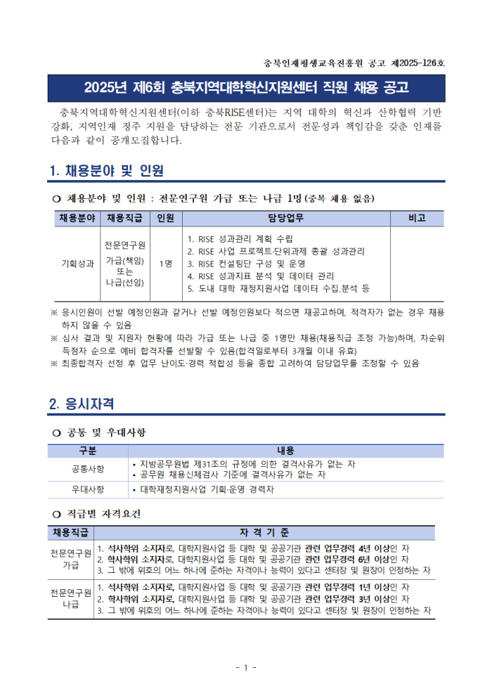 [채용] 2025년 제6회 충북지역대학혁신지원센터 직원 채용 공고